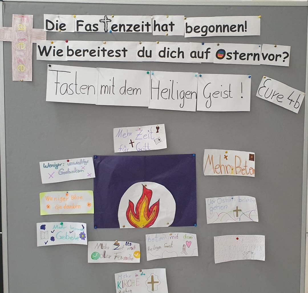 Wir bereiten uns nun in den Klassen auf das Osterfest vor, an dem wir die Auferstehung Jesu feiern. Die Klasse 3c gestaltet dazu während dieser Wochen die Wand im Eingangsbereich mit Ideen, wie man fasten kann: mit dem Mund, mit den Ohren, mit den Augen oder mit den Händen. Jede Woche finden wir dazu neue Vorschläge und Anregungen.